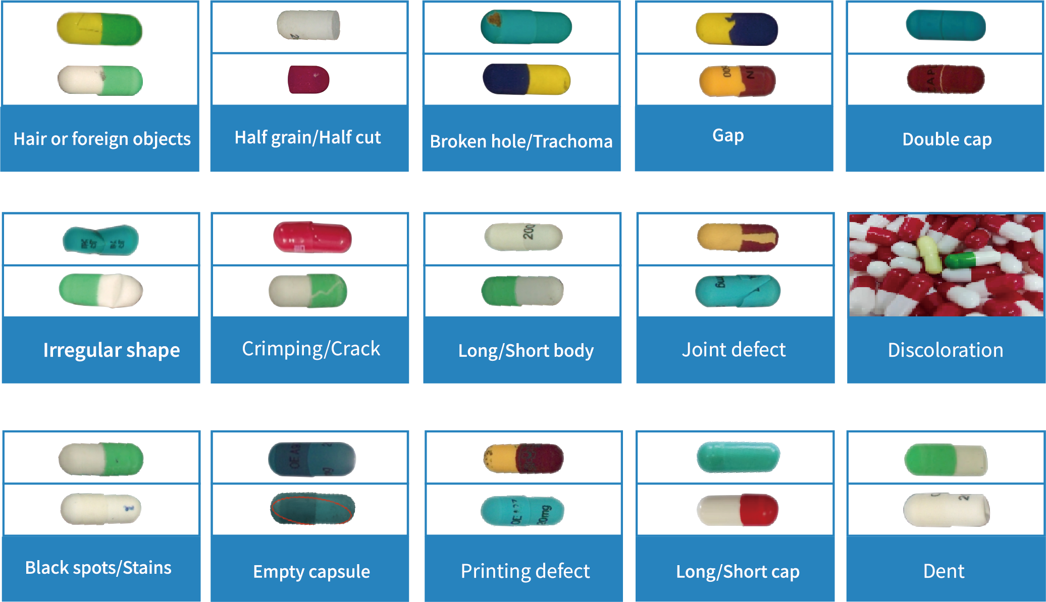 Different-color capsules, broken capsules, black spots, stains, different-shape capsules, concave top, double cap, fracture, bad printing, hair, no printing, long body, short body, long cap, short cap, long sac, short sac, capsule not round, capsule split, wrong cap, deflated shell, empty capsule, etc.